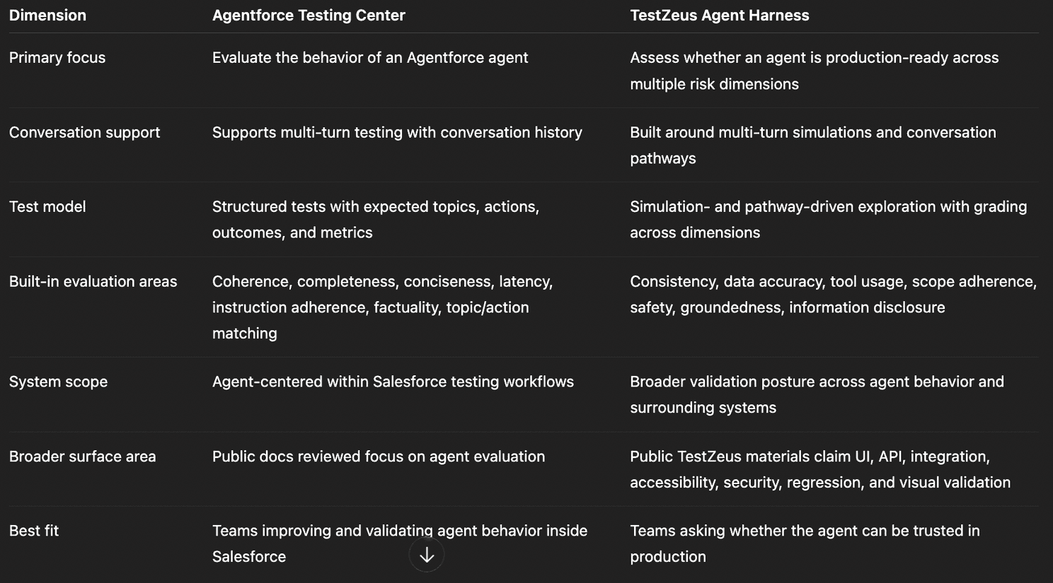 If our immediate goal is to evaluate whether an Agentforce agent behaves as intended inside Salesforce’s own testing model, we would absolutely consider Testing Center a credible starting point. That is a stronger position than some older comparison narratives give it credit for. (Developer)