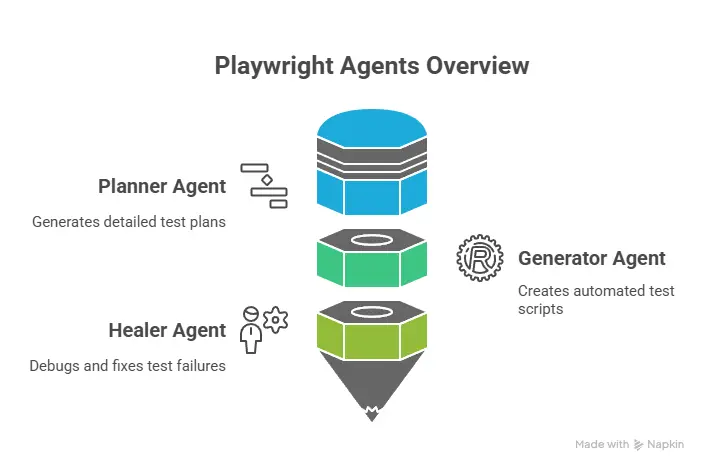 Playwright now documents “Test Agents” out of the box: planner, generator, healer—where the planner explores and creates a plan, generator turns it into tests, and healer runs and repairs failing tests. (Playwright)